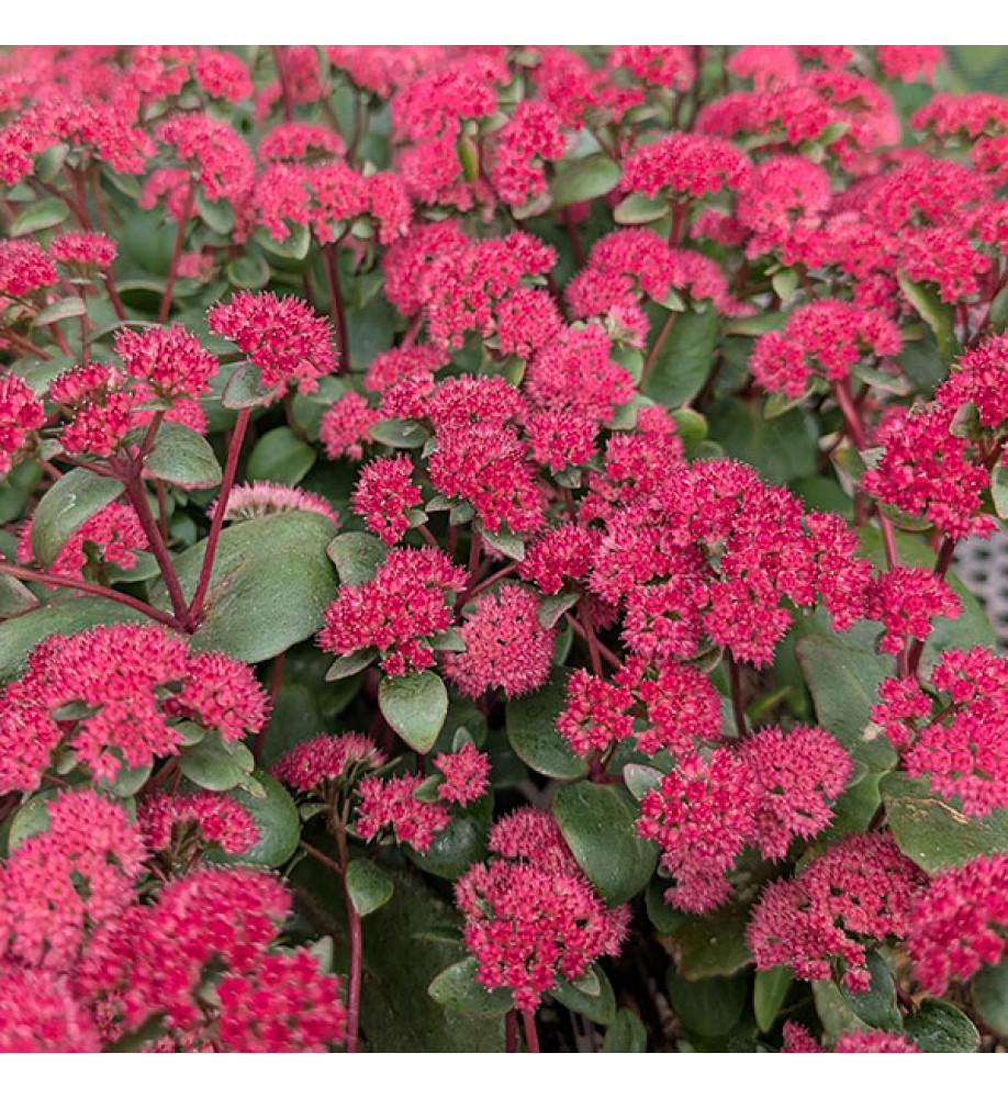 Clump forming perennial with purple tinted, bluey green leaves. Densley packed bright red flowers that resemble cauliflowers and last for ages in late Summer. Height and spread to around 30cm.