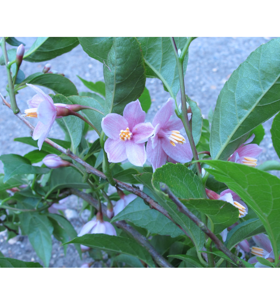 A large graceful shrub or small tree. Wide spreading branches often drooping with glossy mid/dark green leaves that turn yellow and red in autumn. Pretty delicate pink snowbell flowers hang in clusters from the branches in June-July. Height and spread to 4m x 2m. Prefers a sheltered spot in neutral to acid soil in sun or dappled shade.