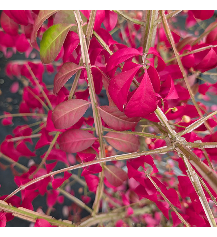 Winged Spindle. A dense shrub with dark green leaves turning brilliant red in autumn. Stems have corky wings. Almost round reddish purple fruit opening to orange seeds Height 2m spread 3m.