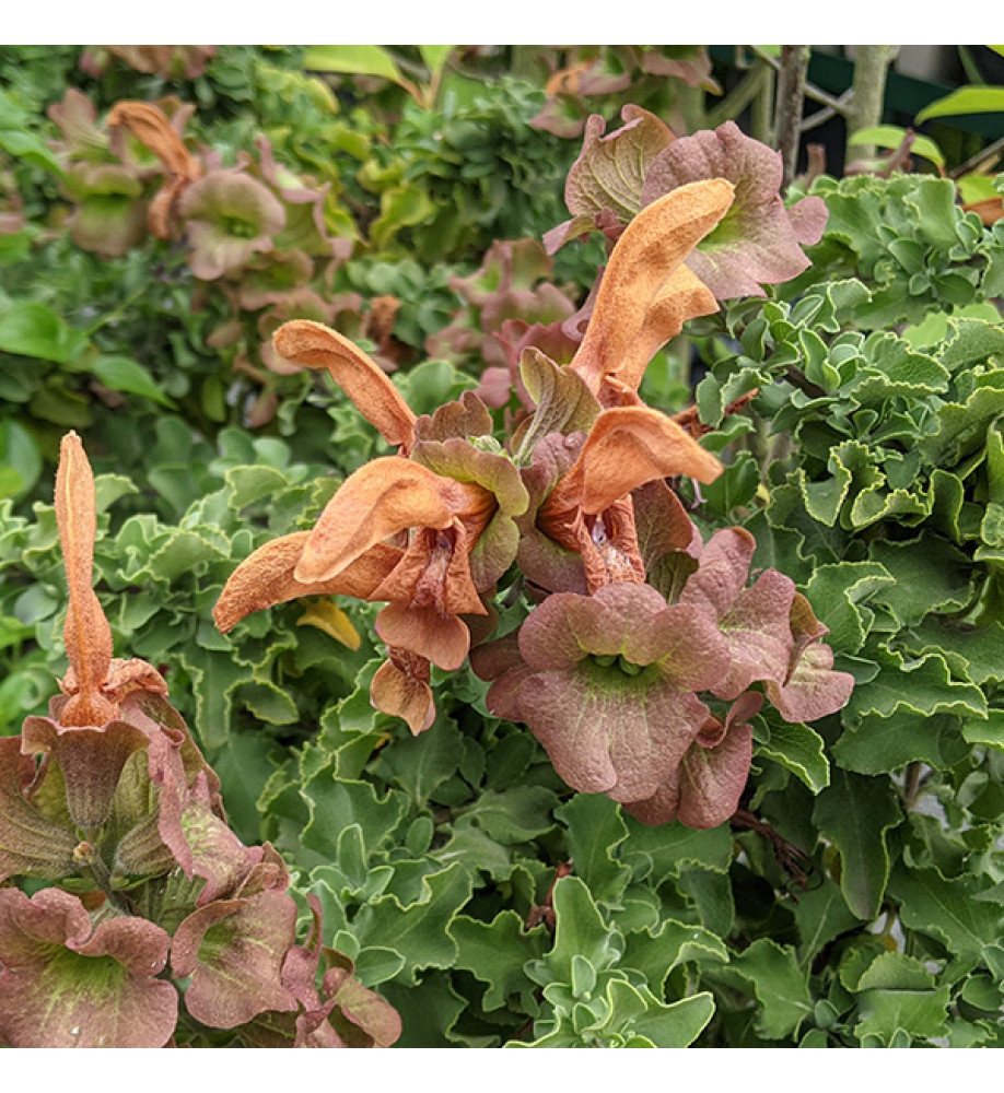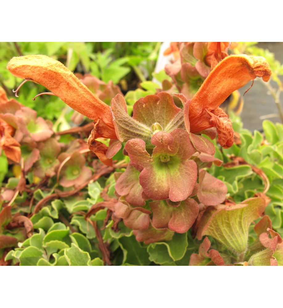 Large lipped flowers of unusual marmalade orange colour. Aromatic leaves. Height to around 60cm. Well drained soil in a sunny sheltered site. Will need some winter protection in severe winters.