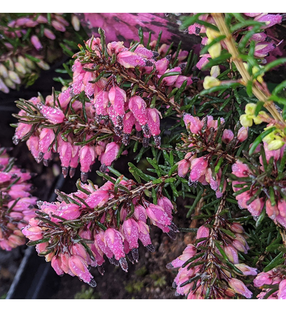 Deep green needle like foliage with dark reddish purple flowers from late winter through to spring.. Prostrate shrub to around 15cm tall by 45cm wide. Excellent alpine heather and groundcover. Any soil in sun but does best on neutral to acid soils.