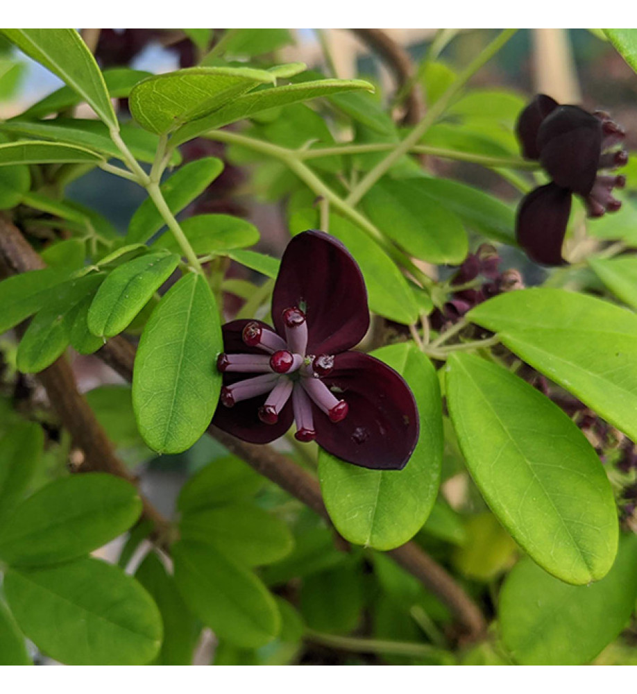 Select form of chocolate vine from Taiwan with vanilla scented maroon flowers in April and May. A twining and unusual climber. Sometimes has rather showy blue-purple fruits the shape of mini baguettes. When ripe they pop open to reveal a pure white interior with seeds encased in an edible jelly that tastes like a melon. Male and female flowers are produced on the same plant but pollination aids are required by insects or a brush! Moist humus rich soil in shade or part shade. Height and spread to 5m x 4m but can be trained to much smaller spaces.