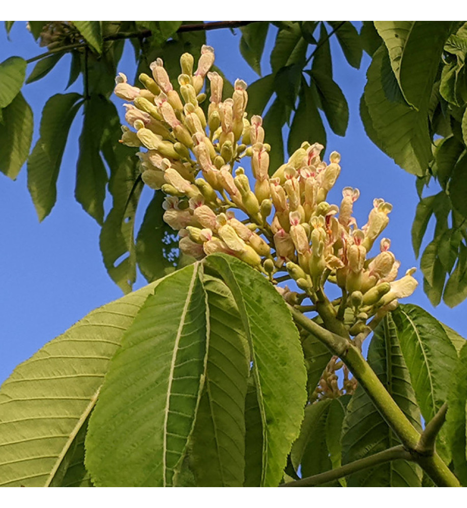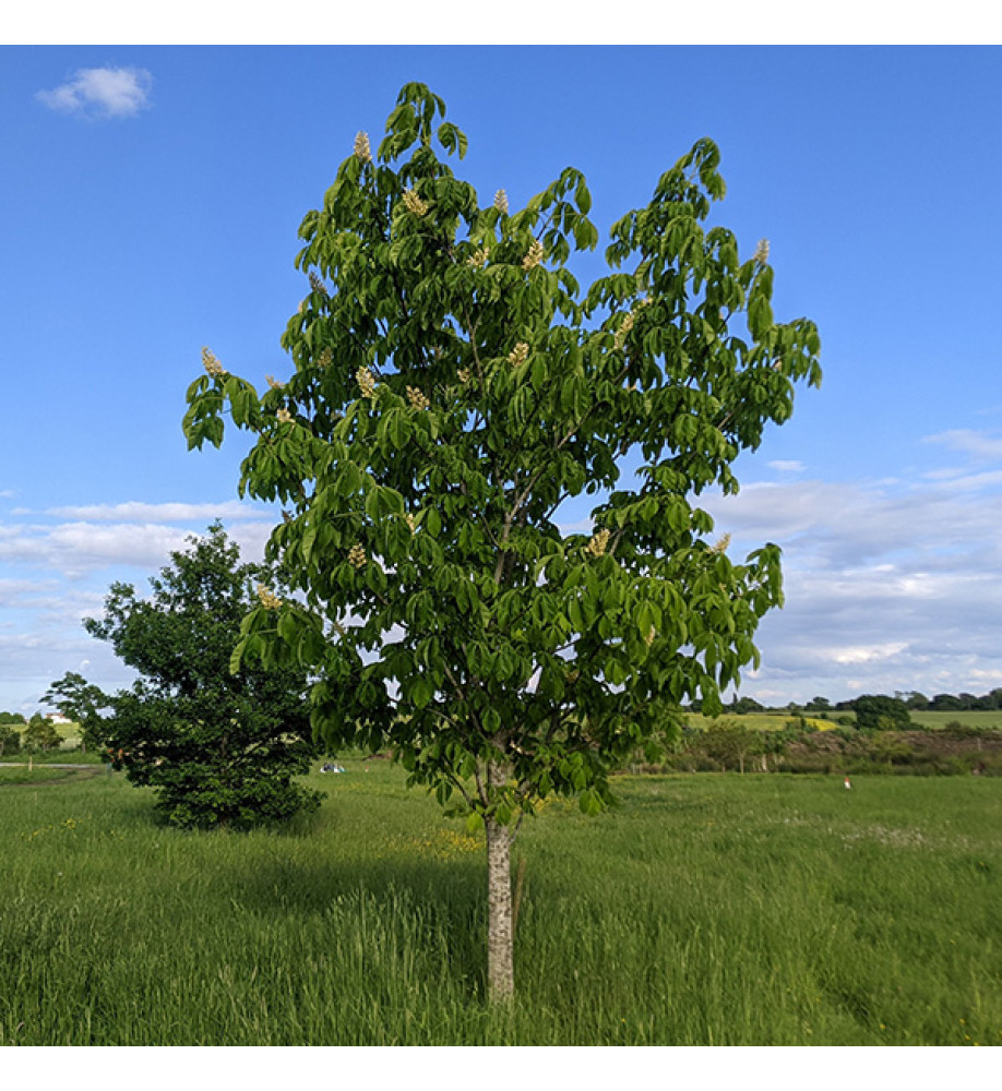 'Yellow buckeye'.  Yellow flowered conker tree. Majestic tree for large spaces and parkland.  Large, palmately compound green leaves comprising of 5 toothed leaflets give good yellow orange autumn colour. Candle like panicles of yellow -green flowers in late spring followed by smooth fruit cases containing chestnut brown conkers. Height and spread to around 20m x 10m.