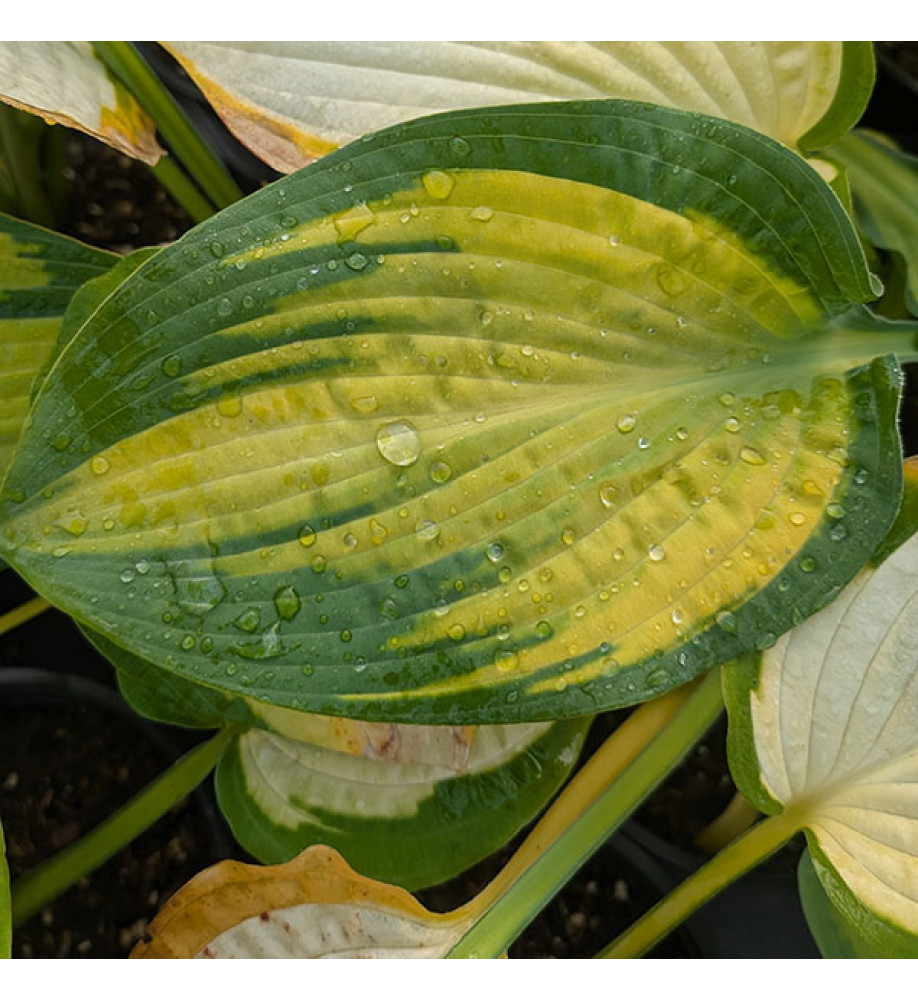 Brilliant dark golden spring foliage with a wide blue edge brighten to white gold as the summer progresses. A good clump former reaching 30-60cm in height and spread topped by light lavender flowers in late spring. This variety is extra special for holding onto the leaf in winter providing autumn colour, a wonderful effect. Most moist soils in shade, part shade or sun.