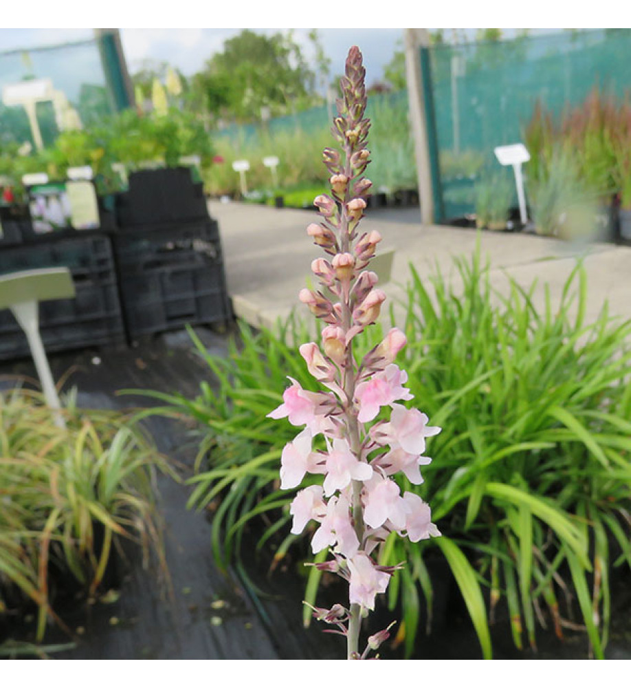 Toadflax. An erect perennial with mid-green leaves and slender spikes of shell pink flowers throughout summer into autumn. Easy to grow in sun or part shade. Height up to 1m.