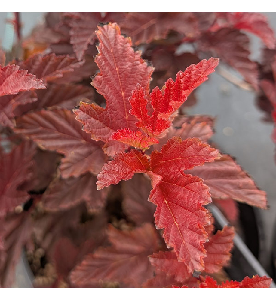 A very useful small leaved form of Physocarpus with an eventual height to around 1.2m. Orange to purple new leaves mature to a burgundy red. Forms a bushy upright shrub. In early summer clusters of white flowers form at the tips of the branches are followed by red fruits in late summer. Good in pots and/or borders. Hardy and easy to grow. Sun or part shade. Attracts bees.