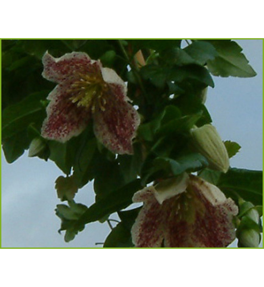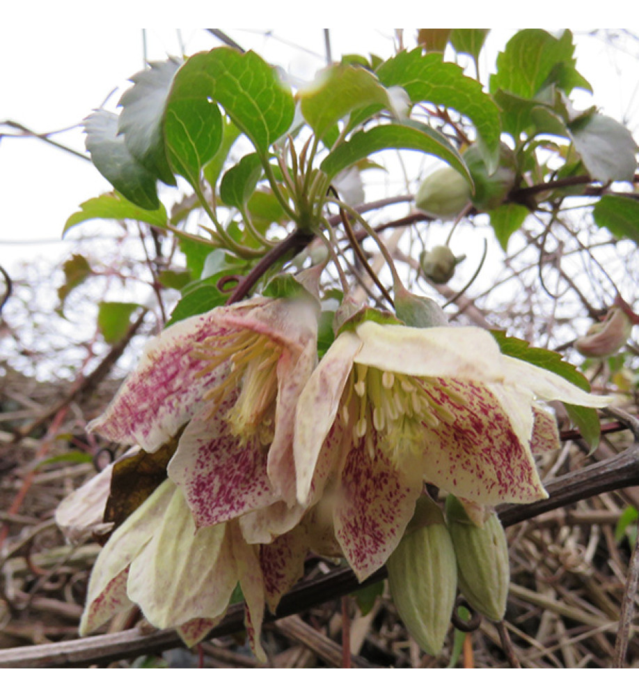 A very popular New Zealand evergreen clematis flowering from mid-winter to early spring. Flowers are bell shaped with creamy white petals that are heavily marked with maroon freckles. Well drained soil in sunny sheltered spot. Prune if required after flowering by cutting back to 3ft (1m) from ground