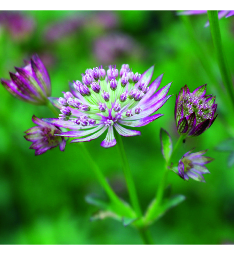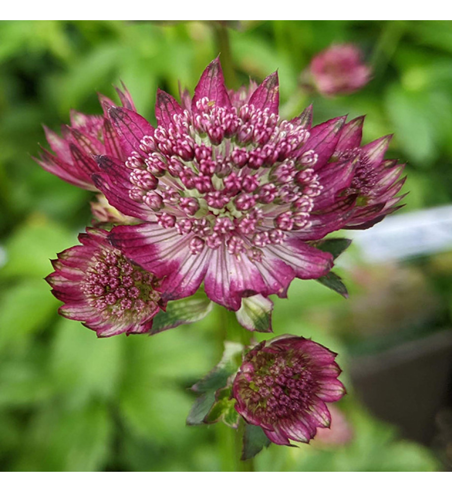 Mounds of deep green foliage topped with dark purple stems holding pincushion burgundy flowers with white tips to the bracts. Height and spread to around 70cm x 40cm. Any good garden soil in sun or part shade. Popular for cut flowers.