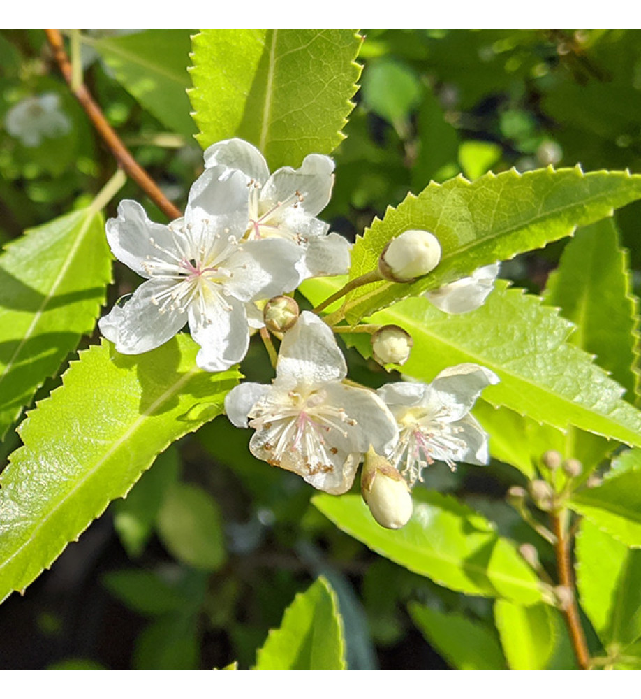 Large, vigorous shrub/small tree with abundant star shaped white flowers and toothed green leaves.