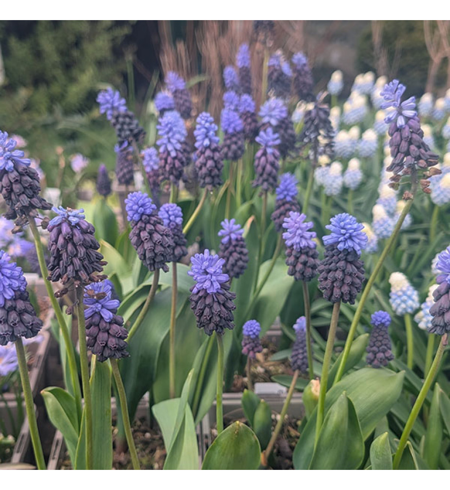 Grape hyacinth. Award winning variety with darkest blue to almost black lower flowers with a top of bright blue flowers. Spectacular when planted in drifts or pots. Height and spread to around 15cm x 10cm. Any well drained soil in sun or light shade.