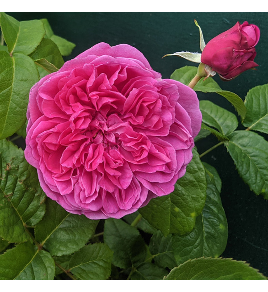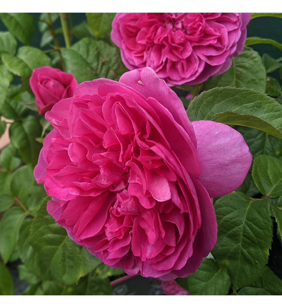 English Shrub Rose. Large many petaled deep pink rosettes with a button eye. Flowers repeat and blooms have a strong fruity fragrance. Bushy and upright habit. Excellent for borders and hedges. Strong healthy growth to around 1.25m. Any fertile soil in sun or light shade