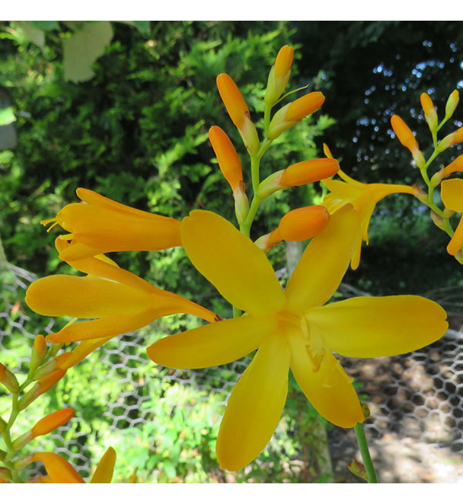 Sword-like mid-green leaves. Arching, branched spikes of golden yellow flowers. Max Height 60cm to 80cm. Max Spread 50cm. Flowers June to August. Full sun/partial shade. Frost hardy. Water thoroughly before planting.