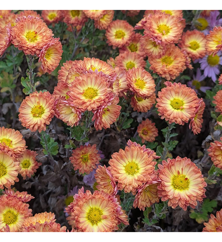 Very showy semi double bronze red yellow flecked flowers with yellow centres. Sturdy upright plant to 90cm tall x 60cm wide. Flowers October-November. Dark red buds give a pleasing contrast. Good for picking and bee friendly. Raiser possibly Alex Cumming Connecticut 1940 maybe an original Bristol Korean. Thanks to Judy Barker NCCPG collection holder for providing a stock plant of this variety.