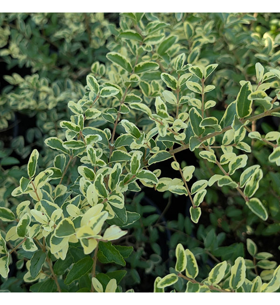 Sage green and cream variegated leaves. A good subject for topiary, a short hedge or a free standing shrub. Clusters of white flowers appear in summer. Height and spread to around 1.8m x 1.5m.