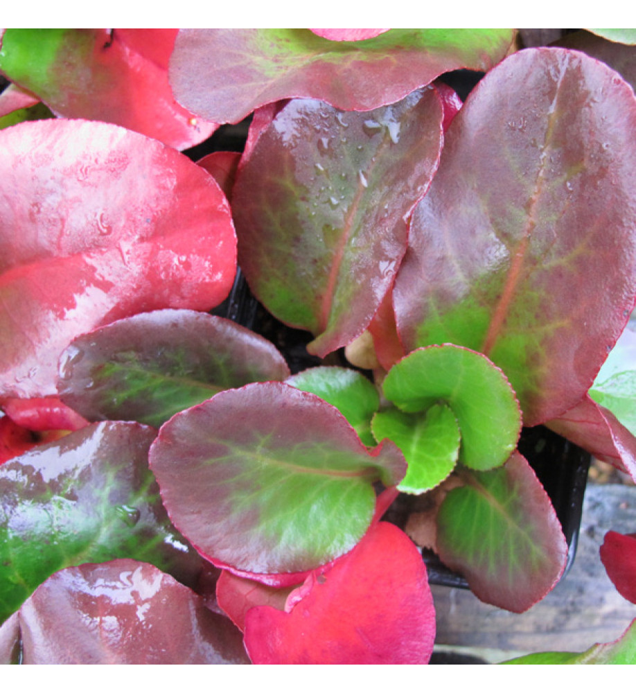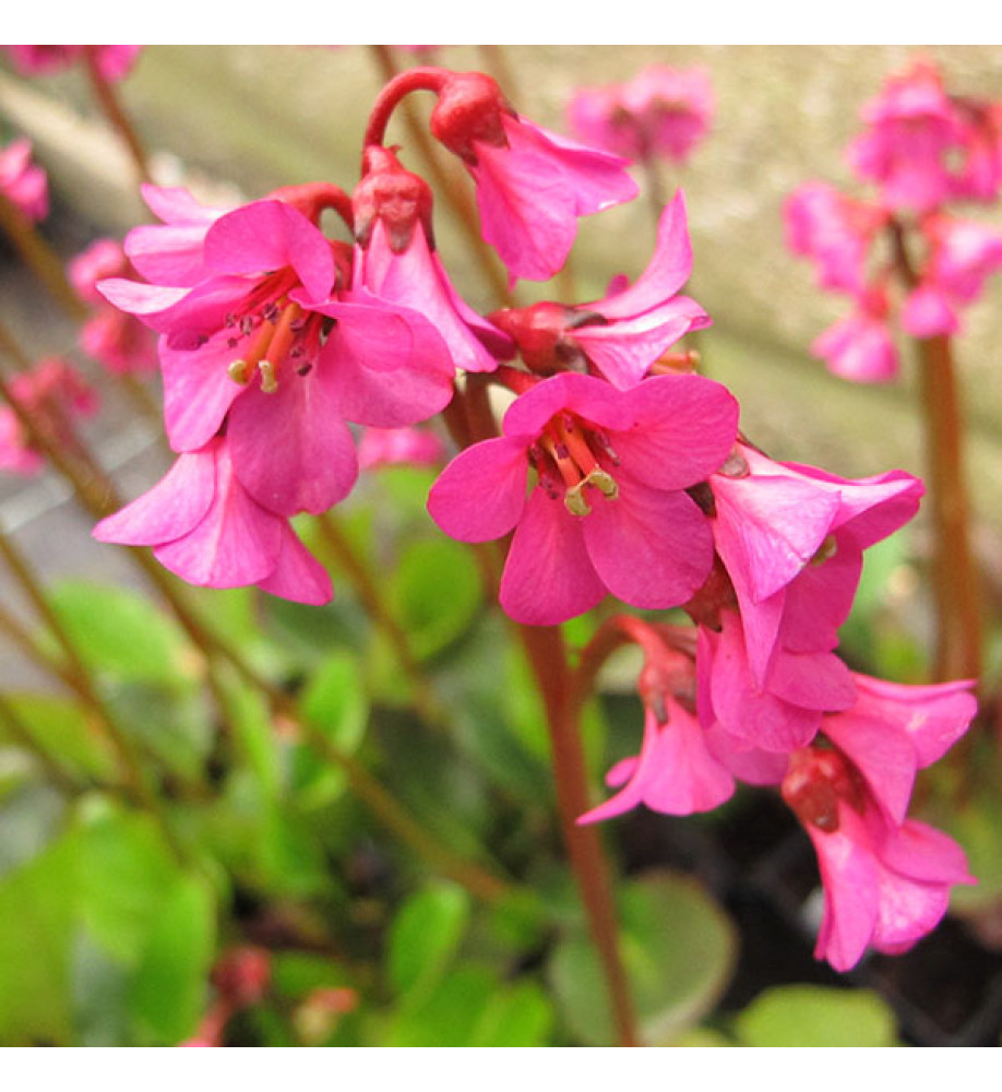 Clump forming. Erect clusters of bright pink flowers appear on red stems above rounded greeny red leaves. Leaves turn fabulous fiery reds and oranges in dry and cold spells. Height and spread to around 45cm.