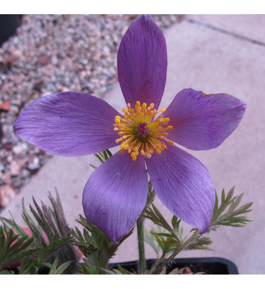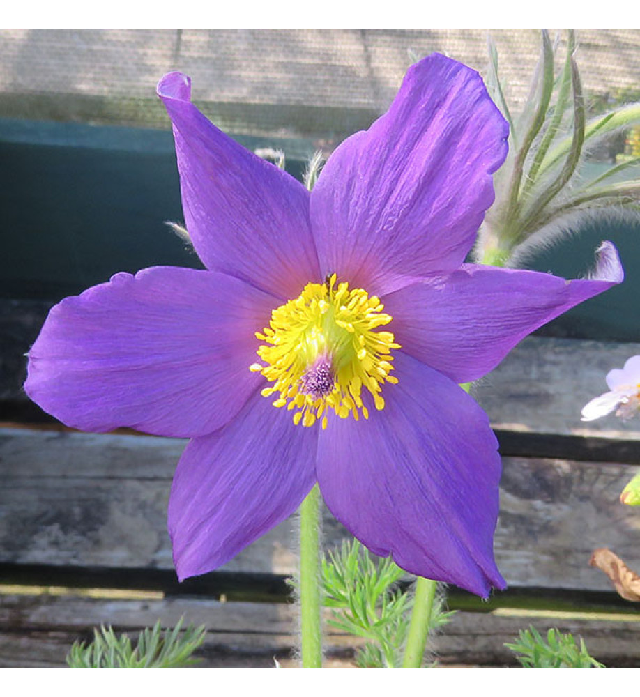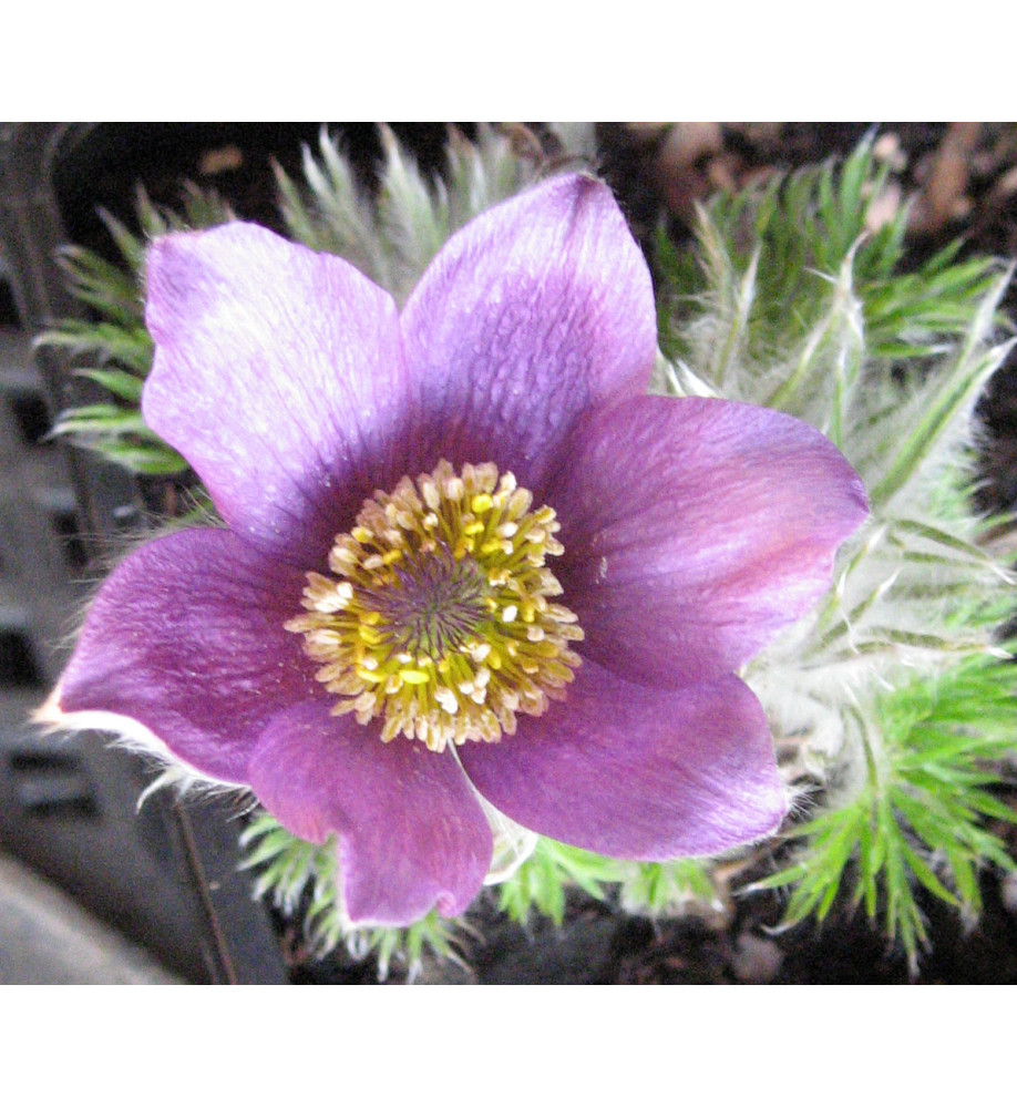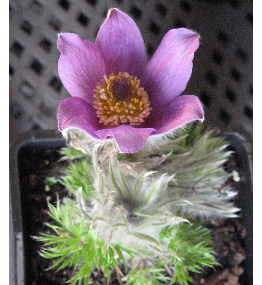 Clumps of finely dissected leaves with hairy bell shaped purple flowers around Easter time. These are followed by fluffy seed heads that last well into summer. Hardy and reliable. A must have for a well drained sunny spot in the garden. Height 12-20cm, spread 20cm.