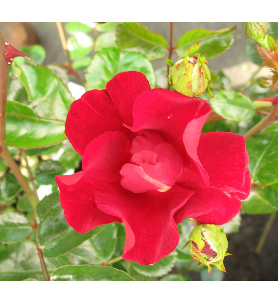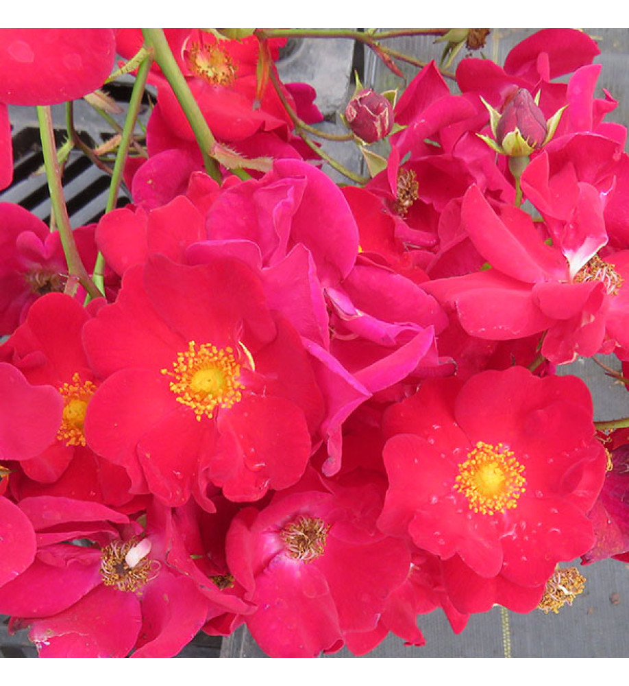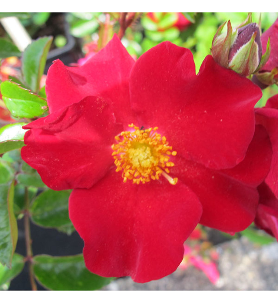 Ground cover rose. Continuous trusses of velvety red flowers with golden anthers over glossy green foliage. Height 60-80cm. Spread 100-120cm. Good disease resistance. Trim back by a third in early spring. Easy and rewarding. Good in the ground or pots.