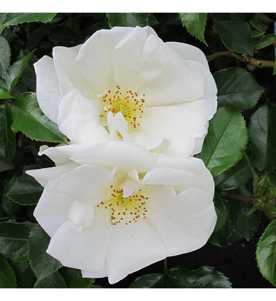 Ground cover Rose. Continuous trusses of white flowers over glossy green foliage. Height 60-80cms, spread 100-120cms. Ideal for growing in a container on the terrace or as a ground cover. Good disease resistance. Trim back by a third in early spring. Easy and rewarding.