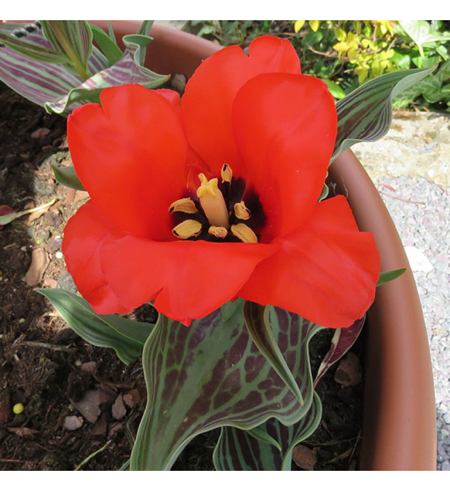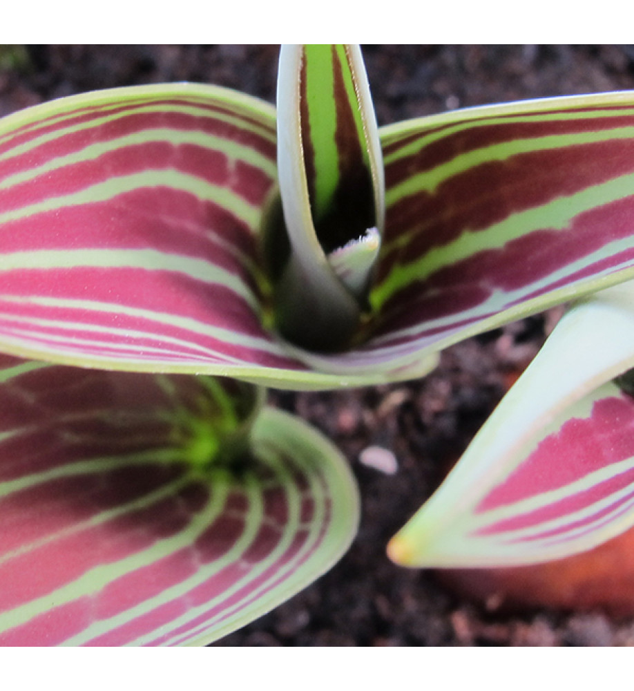 Broad, pointed glaucous green leaves are attractively striped dark brown. Scarlet red flowers with black centres. Height to around 25cm. Any fertile but well drained soil in sun or light shade. Lift bulbs in summer and remove offsets to propagate and replant with a low nitrogen feed in the autumn.